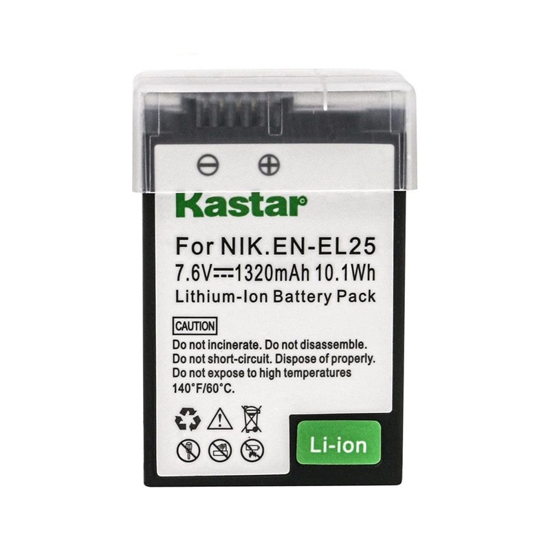 Batera de repuesto para Nikon EN-EL25 y EN-EL25aEs una batera de alta capacidad, ya que utiliza celdas japonesas de alta calidad para una mayor duracin de la batera sin efecto de memoria.La batera de repuesto de iones de litio (Li-ion) de la marca Kastar,