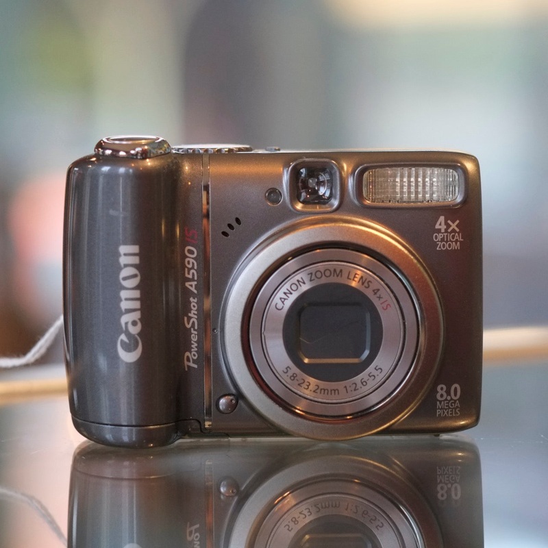 The Canon Powershot A590IS is the last (and best) camera in Canon’s A5XX series. It has a pretty solid 8mp sensor, 4x optical zoom, a real optical viewfinder, an effective image stabilizer, and a complete range of control modes, including full manual. Plus, it runs off a pair of normal AA batteries. This A590 is in excellent condition, with only minor cosmetic wear. A classic point-and-shoot camera, if that’s a thing.
