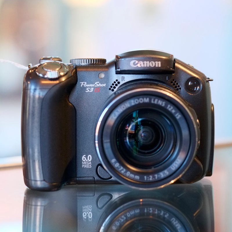 The Canon S3 IS is a 6mp digital camera with a built-in image stabilizer and a 12x optical zoom.Image quality is decent, as long as you don’t stress it with low light shooting: maximum ISO is 800, and it looks… like maximum ISO. In the 100-400 range, though, it’s not too shabby. Zoom and focusing are pretty quick, the camera runs on 4 common AA batteries, and it takes normal SD cards (2gb or smaller, but still.) Some cosmetic wear, good function. Includes strap, lenscap, USB cable, SD card and manual.