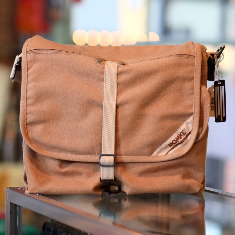 The Domke F-805 is a very large satchel-style bag. Based on the picture, you may be thinking that this is a slight design variation on an F-803, but I assure you that it is not: you can fit an F-803 inside this with room to spare. It’s enormous, with interior dimensions of approximately 15x32x36cm. Each covered front pocket is big enough to carry a medium-sized SLR. There are Velcro strips inside to secure Domke inserts, butno inserts are dividers are included. A detachable carrying handle is included- a shoulder strap is not. Excellent condition, with only minor wear.