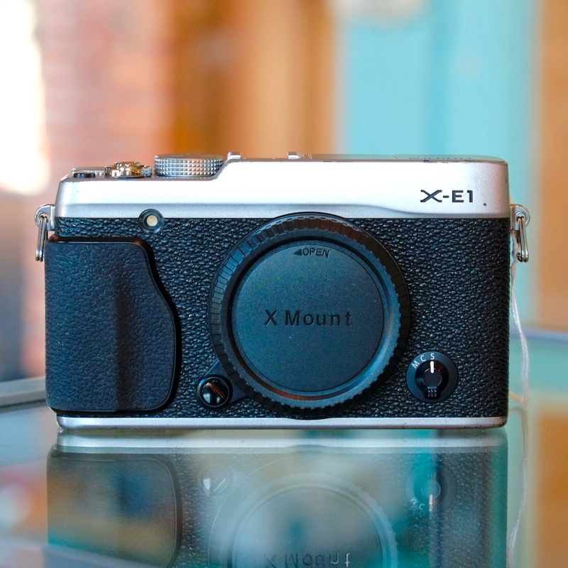 The Fujifilm X-E1 is a compact mirrorless digital camera with traditional dial-based controls, a pretty decentEVF, a 16mp sensor, and HD video capability. Compatible with Fuji X-mount lenses (sold separately), this is a rangefinder-stylecamera with big-camera performance. In adequate cosmetic condition, with some paint wear; rear screen has a few minor scratches. Clearly used, but a pretty solid mirrorless body nevertheless. Includes battery and charger.