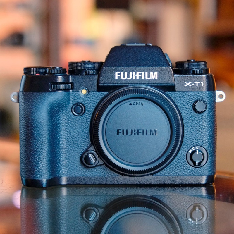 Fujifilm X-T1 digital camera body in excellent condition. The X-T1 is a compact mirroless camera with Fujis X-Trans sensor, quick autofocus, and an excellent electronic viewfinder. Includes battery, charger, flash, and instruction.
