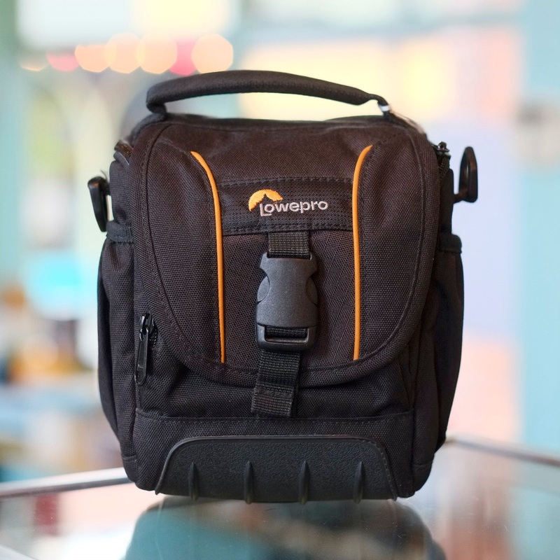 Not Avventura, not Adventure, but, for some reason, Adventura: this is a small Lowepro bag with a name that kind of grates on me, but it’s not a bad little bag otherwise. This Adventura SH 120 II is big enough for a compact DSLR or mid-sized mirrorless camera, with a main compartment measuring approximately 10x14x14cm; there’s also a well secured front pocket and a couple of side pouches. In excellent condition.