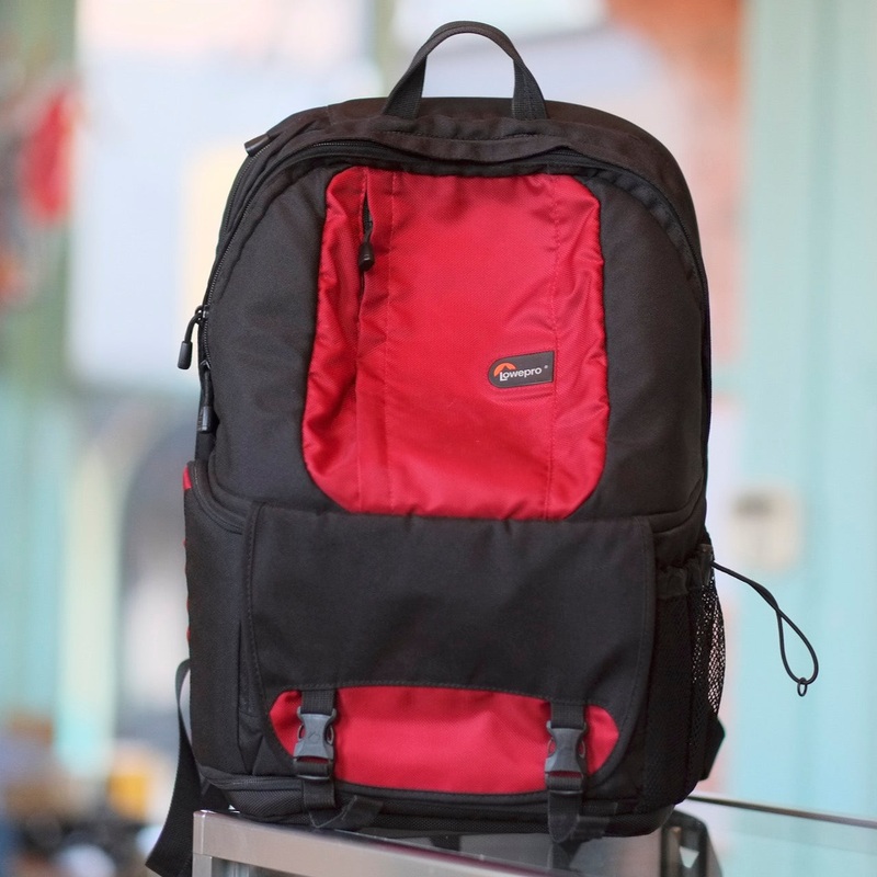 The Lowepro Fastpack250 is a larger midsized backpack with a side-access main compartment and a secondary upper compartment for “lifestyle” stuff (pretty sure there’s a candybar cell phone pocket in there). Also: a large padded laptop compartment. In excellent condition, with minor cosmetic wear. Interior dimensions of the main equipment compartment are approximately 16x20x30cm.
