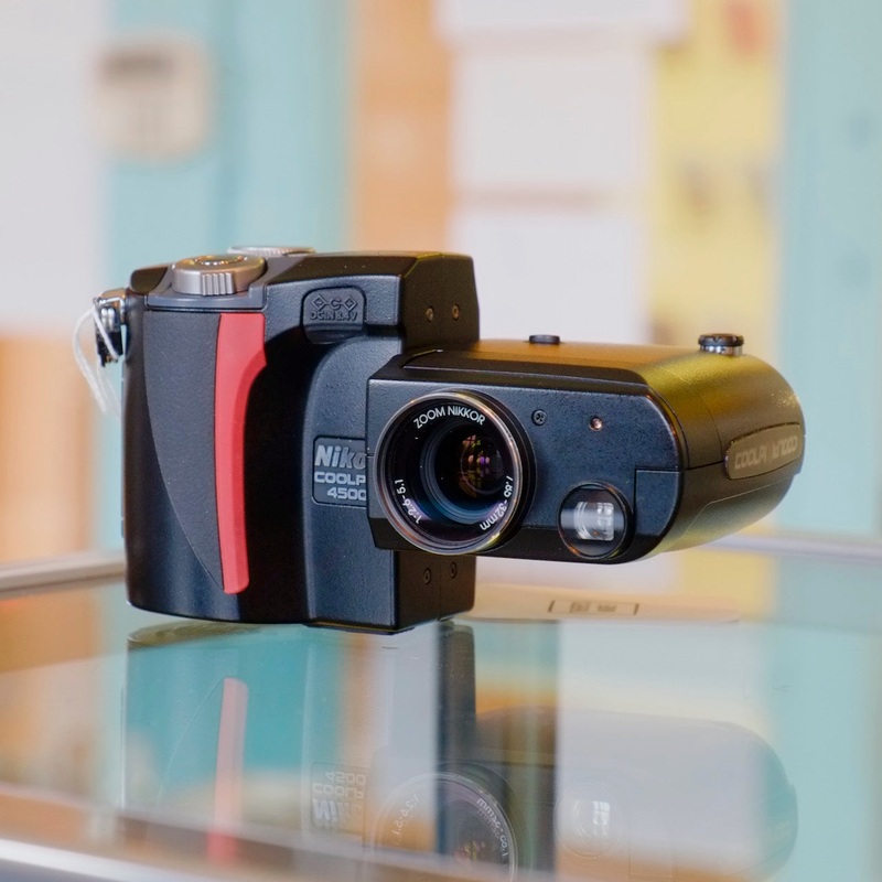 The Nikon Coolpix 4500 is a fixed lensdigital camera with a 4 megapixel CCD display and split body design. This nifty little addition of the split body allows for the side with the lens to rotate 180 degrees. Has a 7.85-32mm Nikkor zoom lens which is clean