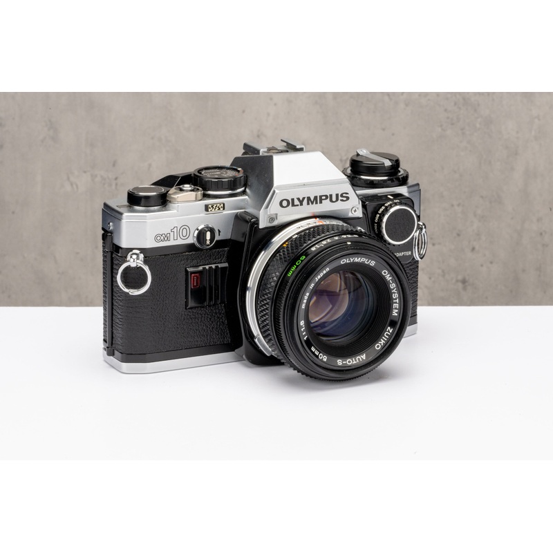Olympus OM-10 w/ 50mm f/1.8 + Manual Adapter 35mm SLR Camera6 month warrantyFully testedCondition: Cosmetically excellent. Shutter firing correctly on all speeds. Light meter accurate within tolerance.Includes: As Seen For more information feel free to cal