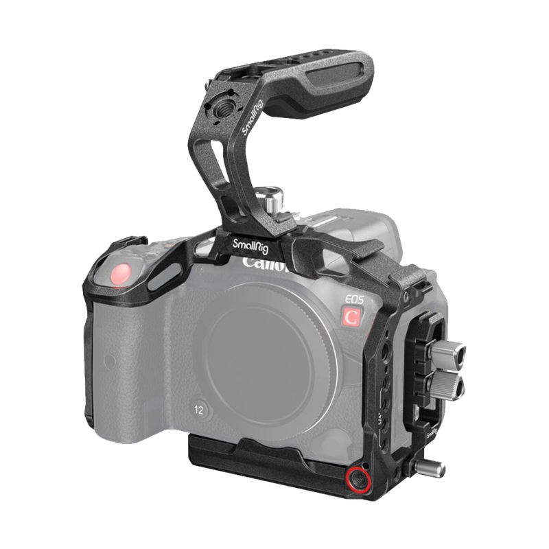The SmallRig “Black Mamba” Handheld Kit for Canon EOS R5 C/R5/R6 is designed to expand the capabilities of your camera while still providing additional protection. This kit includes a formfitting camera cage, a top handle that mounts onto the ARRI-style anti-twist mount on top of the cage, and an HDMI/USB-C cable clamp. This cage mounts securely to the camera body while still providing full access to all ports and doors. All kinds of accessories can be mounted to the cage using the 1/4″-20 and 3/8″-16 threads, NATO mount, and shoe mounts found on the cage kit.