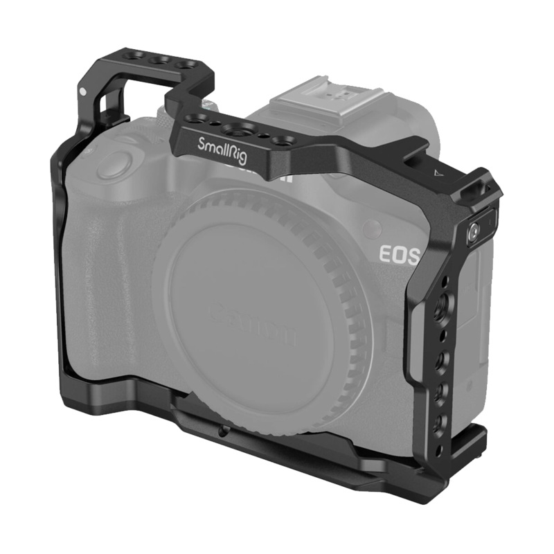 The SmallRig Full Camera Cage for Canon EOS R50 is a formfitting camera cage that provides maximum protection to your Canon EOS R50 while providing additional mounting points for accessories. These include multiple 1/4″-20 and 3/8″-16 threads throughout, a cold shoe mount, and a NATO clamp on the left side of the cage for a cable clamp.