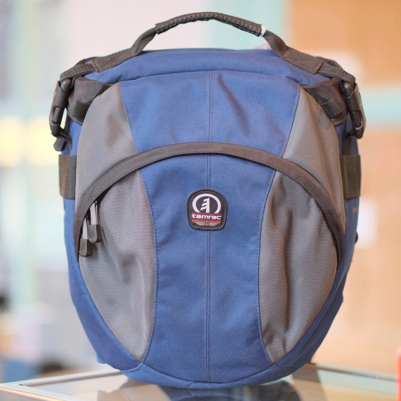 The Tamrac Velocity 9 is a mid-sized sling bag with room for a decent small camera system. It’s wider and shorter than most sling bags, so it’ll sit a bit differently than some similar slings- could be good, could be bad. Worth trying it out. It’s in excellent condition, with minor cosmetic surface wear. Interior dimensions are approximately 30x30x10cm.