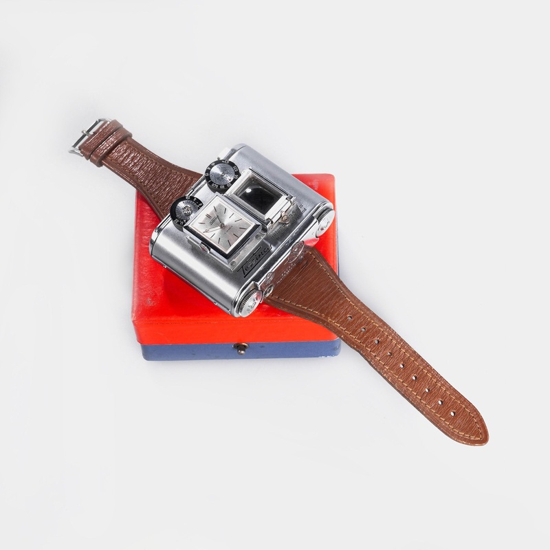 The Tessina Watch is the most rare accessory for the Tessina miniature camera for 14x21mm exposures on 35mm film. — In top condition with camera, wrist strap, case, red presentation box. — A/B — c.1960 — 59130 — Die Tessina-Uhr ist das seltene Zubehr fr die Tessina-Kleinbildkamera fr 14x21mm-Belichtungen auf 35mm-Film. — In Top-Zustand mit Kamera, Handschlaufe, Tasche, roter Prsentationsbox.