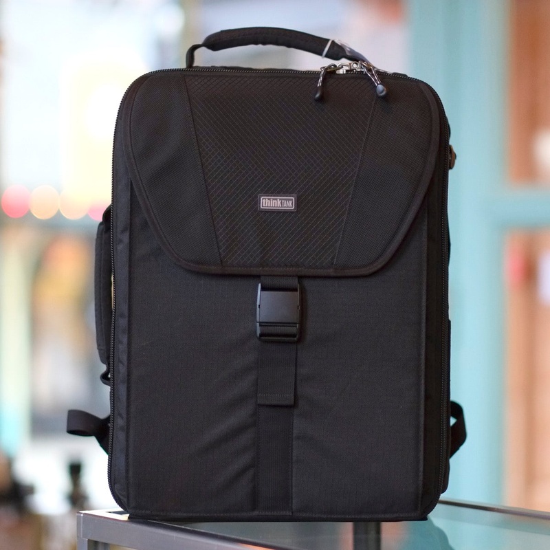 The Thinktank AirportAcceleration v2.0 is a roughly carry-on sized bag designed to hold a fair bit of camera equipment. I say "roughly" because with the backpack straps stowed, it takes a bit of squishing to get it down to the standard 9 inch carry-on thic